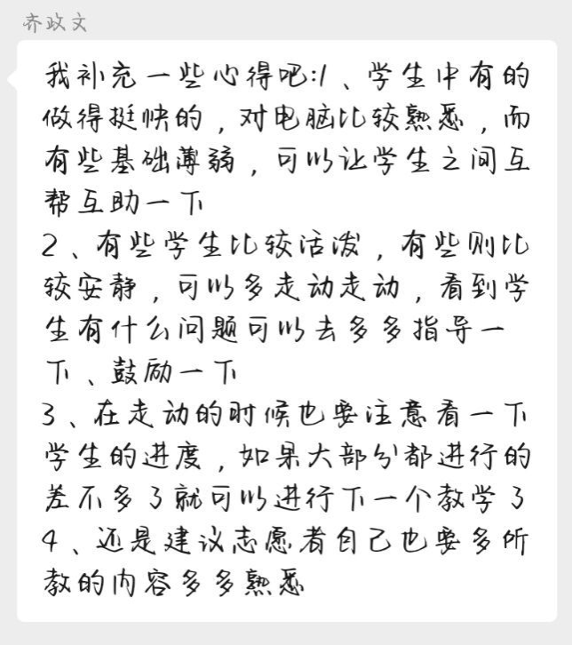 在一天的忙碌教学过后,我们的老师和芯青年们还会写下自己的心得与收获,从而对教学方法和技巧进行改进,努力让更多孩子了解并掌握知识。