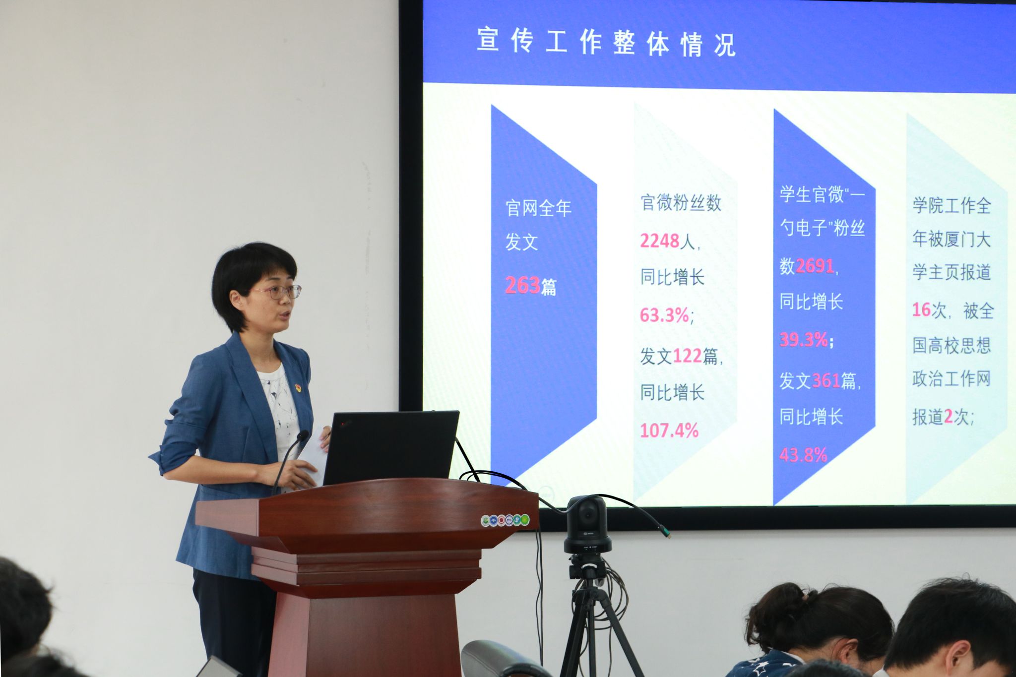 为深入学习贯彻习近平新时代中国特色社会主义思想和习近平总书记关于宣传思想工作的重要论述,总结学院2021-2022学年宣传工作,部署下一阶段宣传工作重点,5月9日中午,学院在翔安校区南存钿楼A513会议室召开2021-2022学年宣传工作总结表彰大会暨宣传技能培训班开班式。学院党委书记吴国瑛,学院党委副书记郑莉,团委书记韩海雄出席大会,各系、中心、研究院宣传工作专员,辅导员,学生宣传中心全体骨干及宣传技能培训班学员参加大会,大会由辅导员严威主持。