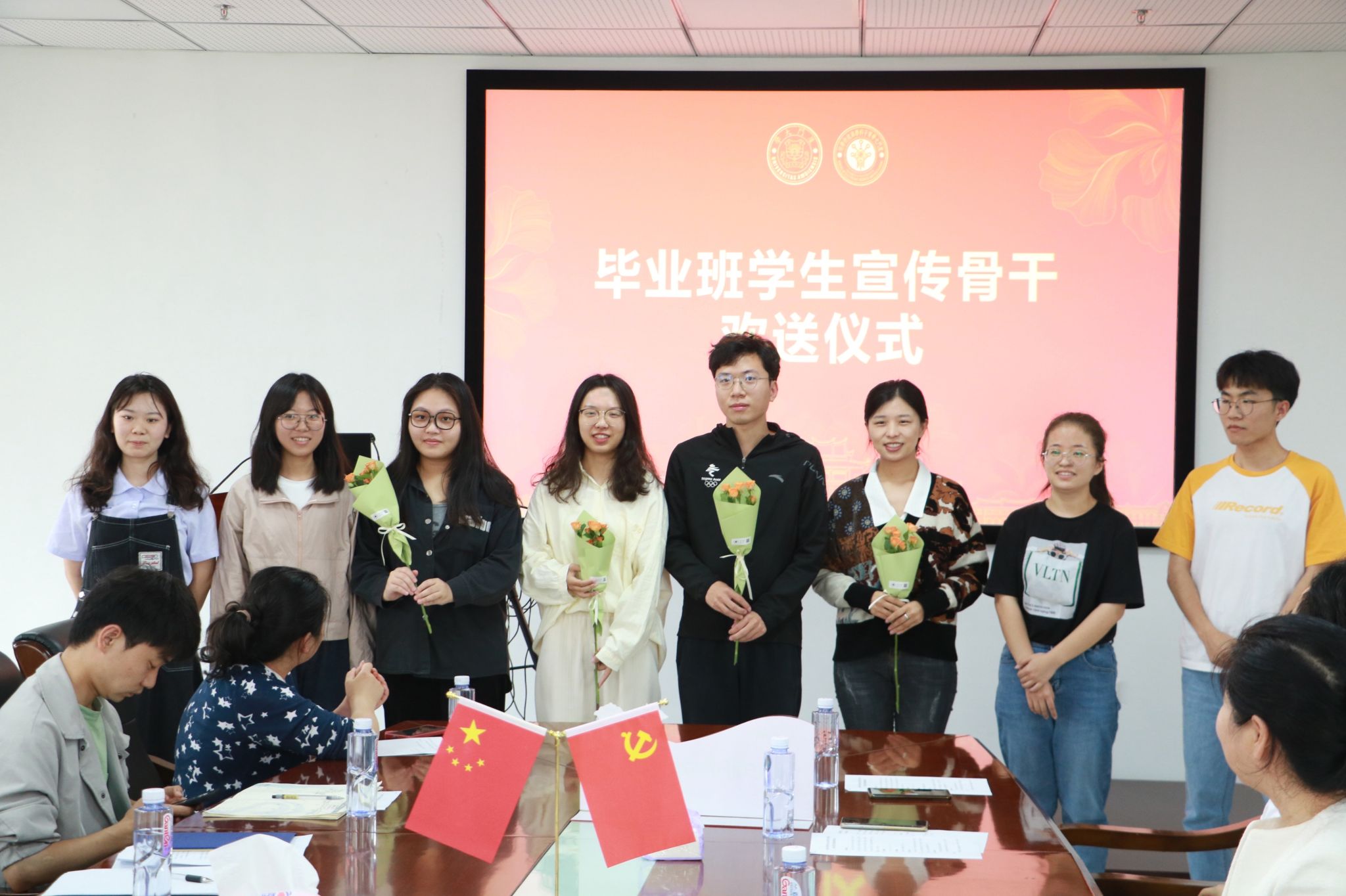 大会还举行了毕业班学生宣传骨干欢送仪式。第三届学生宣传中心骨干李智慧、陈雅娟、苏珏、朱庆骁一一上台,由第四届学生宣传中心骨干为他们献上鲜花,感谢他们长期以来为学院宣传工作做出的贡献,并祝福他们迈向更广阔的新天地。