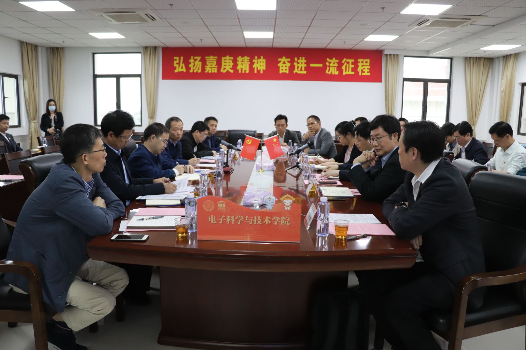院长陈忠作学院工作汇报。他首先回顾了学院的发展历程,并围绕学科建设、人才培养、师资队伍、科技创新及国家集成电路产教融合创新平台等方面,介绍了学院的建设发展概况,指出了学院跨校区办学所面临的挑战和存在的困难,还展望了学院下一阶段的工作思路、工作任务和工作计划。