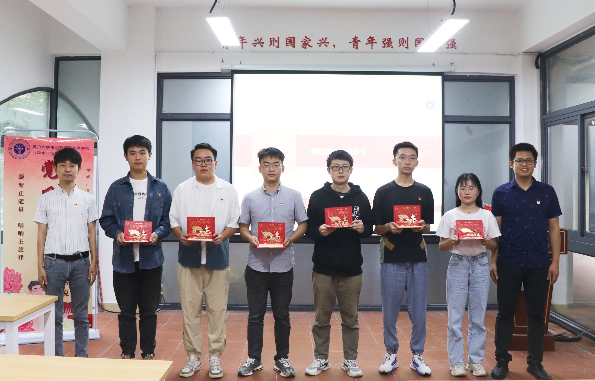 随后,严威、许通向毕业生党员代表姜远远、王凯凯、王汉捷、张之渊、薛璟、陈洁同志赠送政治生日贺卡,希望毕业生党员们牢记党员身份,注重党性修养,踔厉奋发向未来。在许通同志的领誓下,全体党员面向党旗郑重宣誓,通过重温入党誓词,激励党员坚定理想信念,发挥先锋模范作用,在祖国和人民需要时挺身而出。