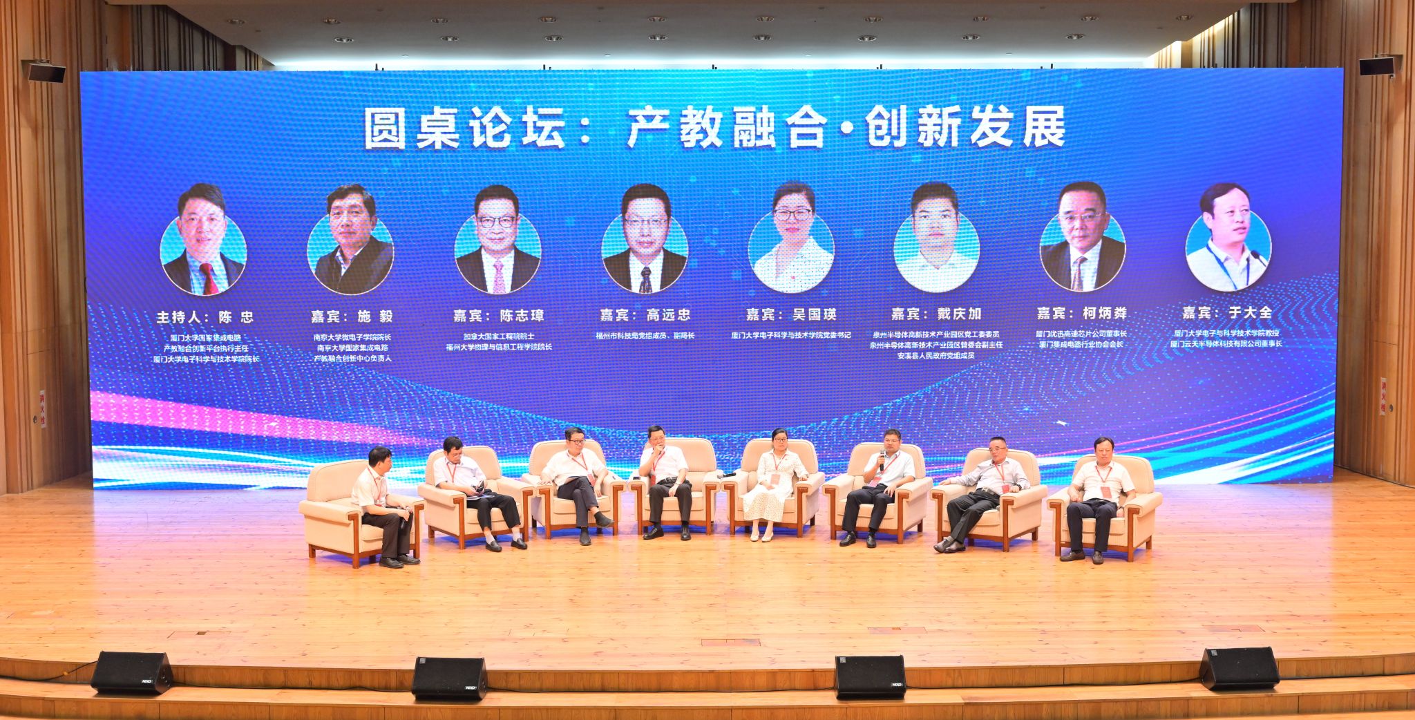 在圆桌论坛环节,围绕“产教融合·创新发展”主题,南京大学微电子学院院长施毅,加拿大工程院院士、福州大学物理与信息工程学院院长陈志璋,福州市科技局副局长高远忠,厦门大学电子科学与技术学院党委书记吴国瑛,泉州半导体高新区管委会副主任戴庆加,厦门优迅高速芯片公司董事长、厦门集成电路行业协会会长柯炳粦,厦门大学电子科学与技术学院教授、厦门云天半导体科技有限公司董事长于大全等七位业内人士畅所欲言。他们从高校、企业、政府与行业协会的角度出发,聚焦校企协同育人、平台资源共享和建立健全长效机制方面,为推动集成电路产教融合积极建言献策。厦门大学电子科学与技术学院院长陈忠主持圆桌论坛。