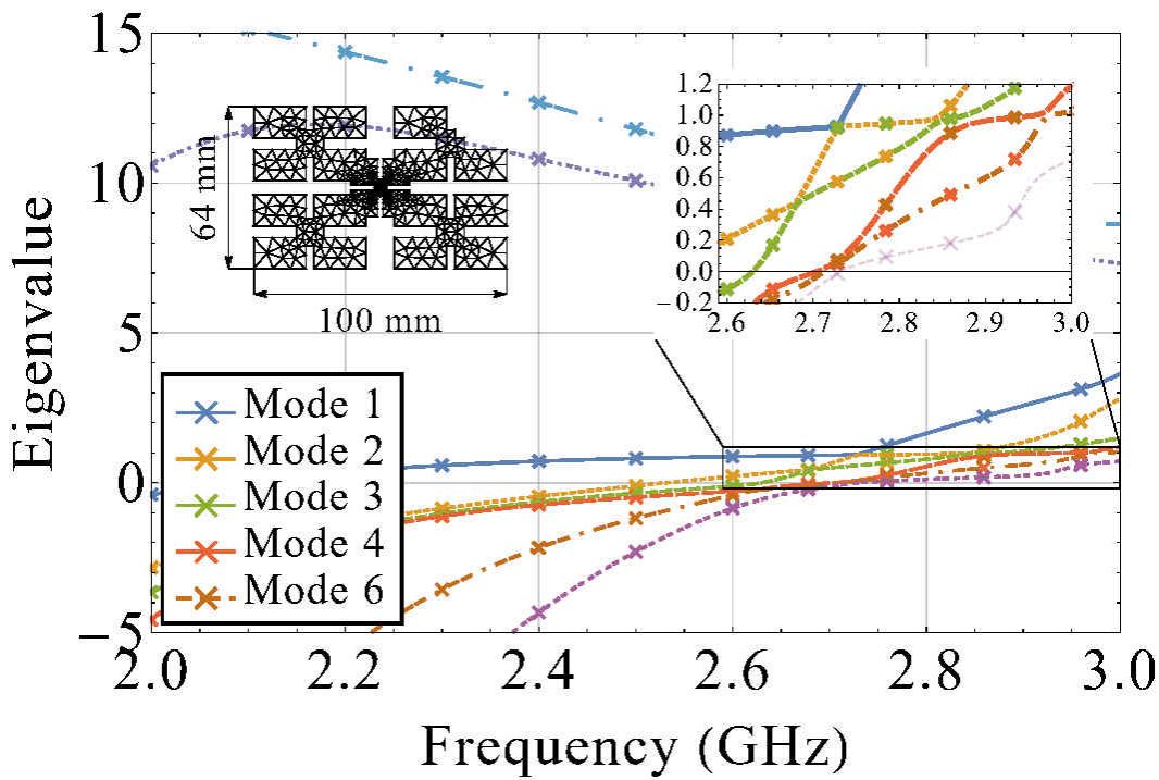 通常,期望频带内每个离散频率点的特征对需要通过模式跟踪算法进行模式归类。模式跟踪算法虽然可在一定程度消除模式跳变交叉,但难以解决交叉避免,而且其效率较低。本研究提出利用前一频率的瑞利商作为后一频率的初始值,如此通过RQI计算出的特征对即是进行了分类的特征模。进一步结合von Neumann–Wigner定理,检测由交叉避免引起的模式重叠和不希望的模式交叉,可在不增加计算代价情况下实现模式校正。由于RQI计算需要检查的模式数远少于阻抗矩阵求解的特征对数,最终能以三阶收敛速度实现模式计算和分类。这种特征模分析方法在具有对称性和对称性破缺两类结构中都得到了验证。