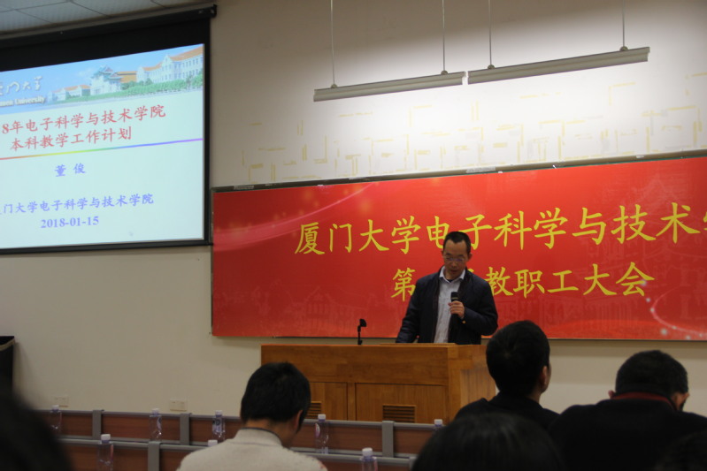 陈忠在会上做了《院情汇报》,对学院基本情况、未来建设与发展思路进行了阐述和解读,并向大家介绍了学校最新的绩效考核方案。董俊做《2018年电子科学与技术学院本科教学计划》报告。张保平做《2018年电子科学与技术学院科研工作及研究生教育》、《基金动员》报告。