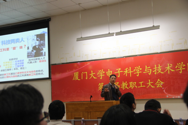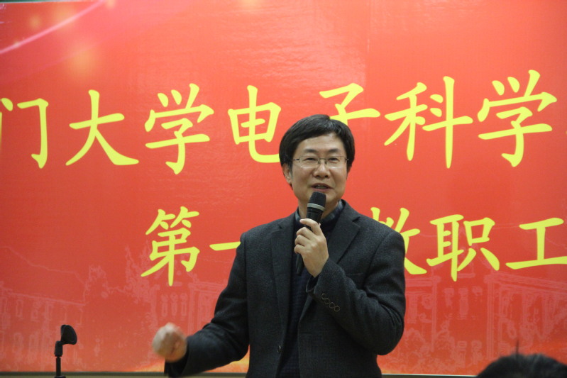 1月15日下午,电子科学与技术学院召开第一届教职工大会。厦门大学校工会副主席李招淡,离退休教师代表黄云鹰、肖芬作为嘉宾出席,院党委书记吴国瑛,常务副院长陈忠,副院长董俊、张保平以及全院教职工出席了大会。参加本次大会的,还有物理学院微电子、萨本栋微纳院的老师代表,会议由吴国瑛主持。