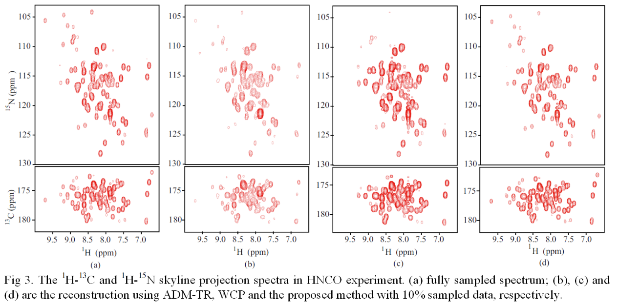 图3. 所提方法与低秩张量重建方法对10% 三维HNCO蛋白质谱重建结果