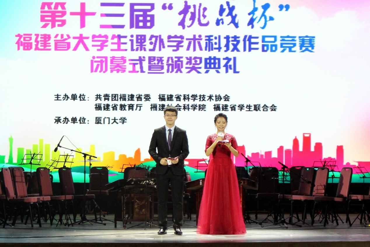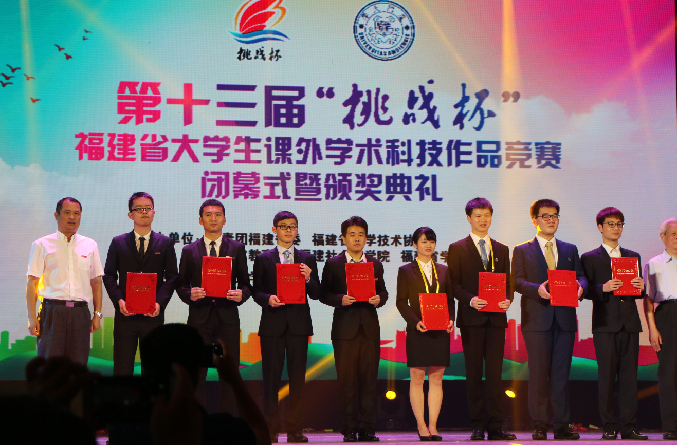 5月20日,由共青团福建省委、福建省科学技术协会、福建省教育厅、福建社会科学院、福建省学生联合会主办的“挑战杯”福建省大学生课外学术科技竞赛决赛在厦门大学举办,75件作品从来自全省39所高校320件作品中脱围而出,进入决赛环节。在5月20日上午的决赛环节中,经过专家的最终评审,评出特等奖11项,一等奖20项,二等奖54项。5月20日晚七点半,第十三届“挑战杯”福建省大学生课外学术科技竞赛闭幕式暨颁奖典礼在厦门大学建南大礼堂隆重举行,厦大党委副书记林东伟等领导参加此次颁奖典礼,为获奖团队颁奖。