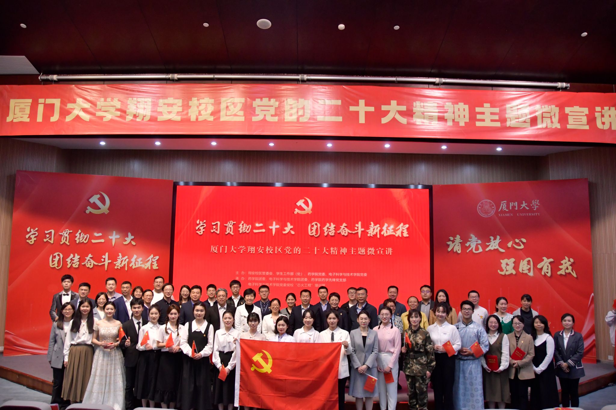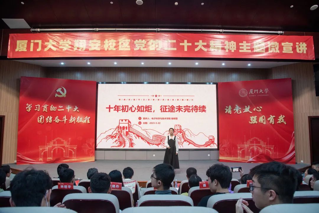 3月22日晚19:30,厦门大学翔安校区党的二十大精神主题微宣讲在图书馆2号报告厅隆重举行,校组织部、党建办、学生工作部、教务处、翔安校区管委会、药学院党委等单位领导和300余名师生一起参加活动,我院党委书记石慧霞、党委副书记方银水一同出席本次活动。2022级电磁声学研究院硕士生杨明雪通过初赛重重选拔进入当日的决赛中。