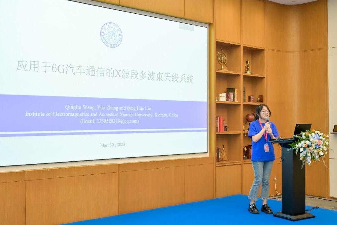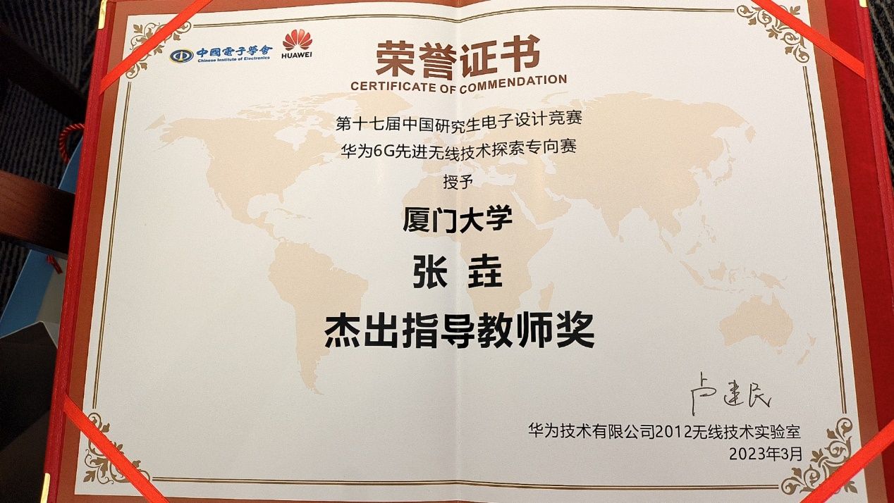 在此次分享交流活动中,队长王清柳首先对团队作品进行了简单的汇报介绍。本作品基于对未来6G汽车-卫星通信的构想,提出了一种在X波段具有多波束扫描的天线系统。之后,团队成员与华为6G研究团队的专家进行了面对面的交流互动,并与来自清华大学、国防科技大学等高校的团队成员和老师进行思想的碰撞,同时华为为张垚老师颁发了“杰出指导教师奖”。