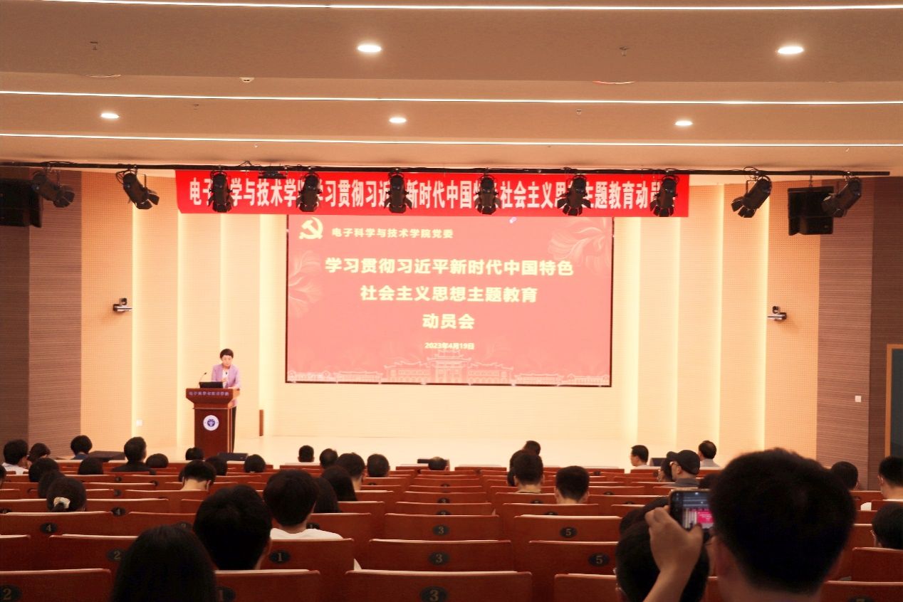 为贯彻落实习近平总书记在学习贯彻习近平新时代中国特色社会主义思想主题教育工作会议上的重要讲话精神,根据校党委的部署安排,经学院党委研究并报请学校主题教育第七巡回指导组同意,4月19日下午,电子科学与技术学院在翔安校区南存钿楼C座4楼报告厅召开学习贯彻习近平新时代中国特色社会主义思想主题教育动员会。学院党委书记石慧霞主持会议并作动员讲话。学校主题教育第七巡回指导组成员薛志平到会指导并讲话。学院党员领导干部、党委委员,分管本科教学工作系主任,工青妇负责人,全体师生党支部书记,辅导员、党务秘书、师生党员代表约140余人参加会议。
