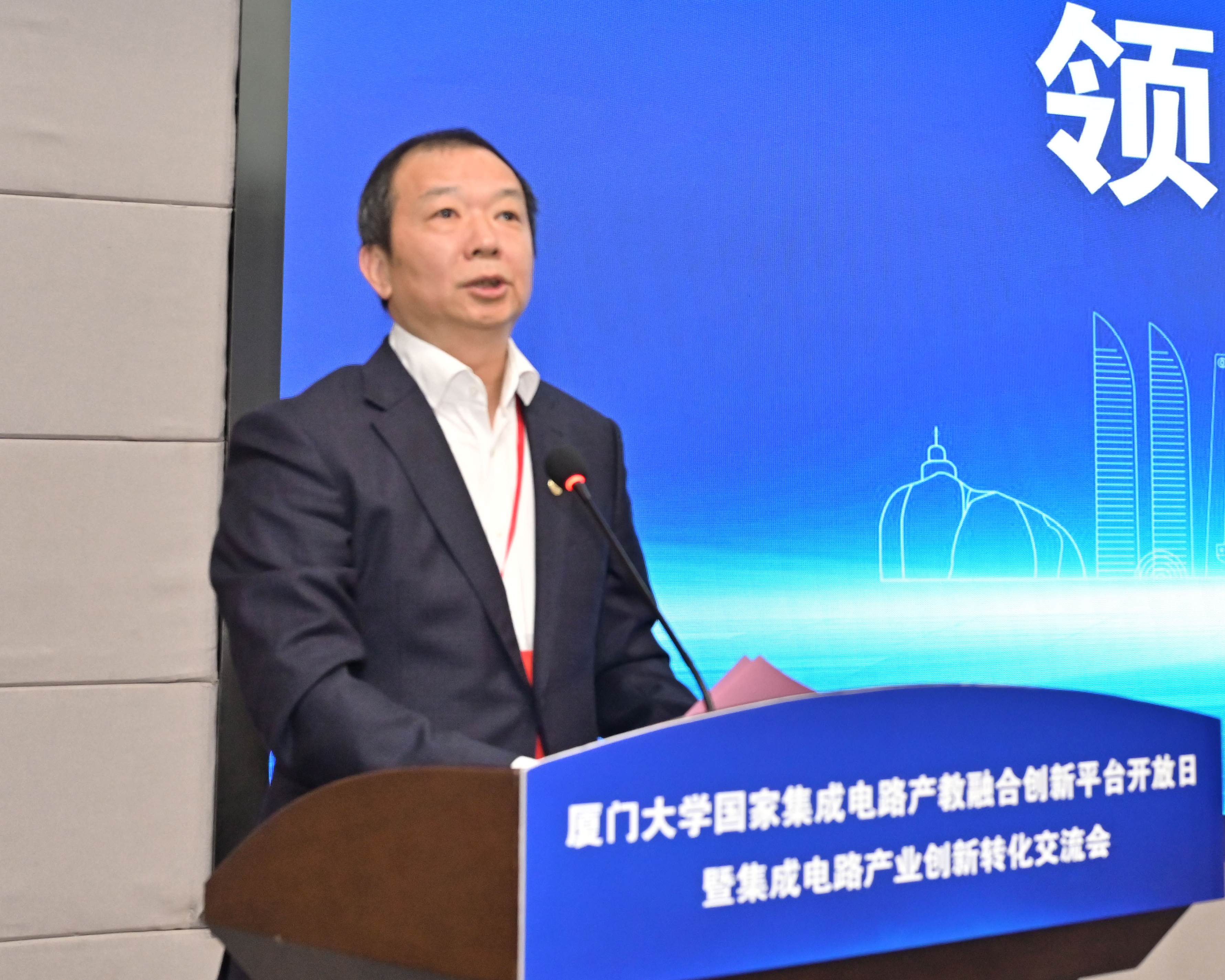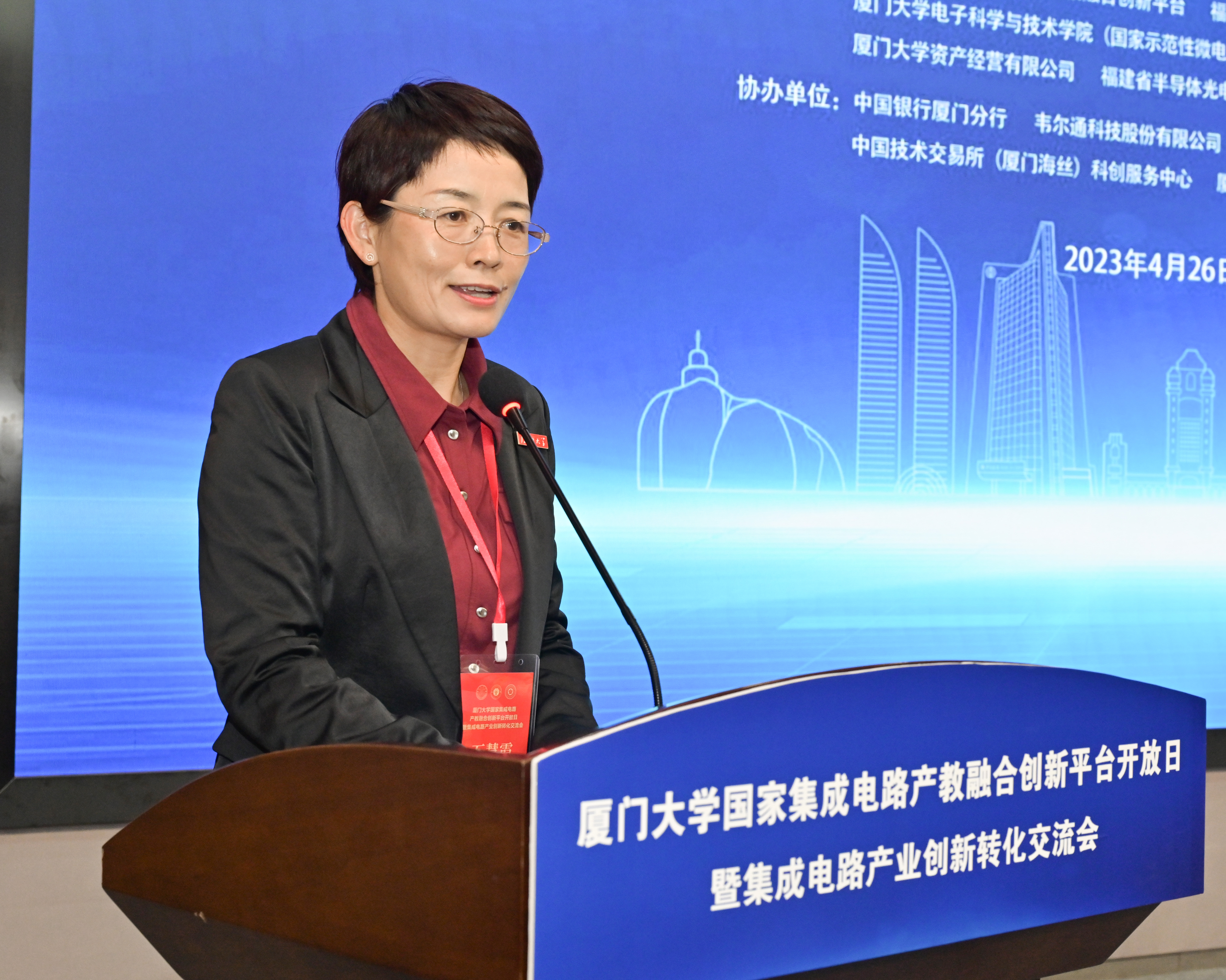 翔安区副区长颜莉莉致辞。她指出,集成电路技术是信息社会的基础,也是国家综合实力的体现。翔安区是厦门重要的先进制造业产业基地,已经形成包括平板显示、半导体和集成电路在内的千亿级电子信息企业产业链条。厦门大学翔安校区的设立,为翔安区的发展增添了活力、动力和无限可能。翔安区将持续加强与厦门大学的校地合作共建,强化双方在培养人才、科学研究、研发创新、成果转化等方面合作,着力实现人才共培、项目共育、产业升级、合作共赢,不断推动翔安区经济的高质量发展。