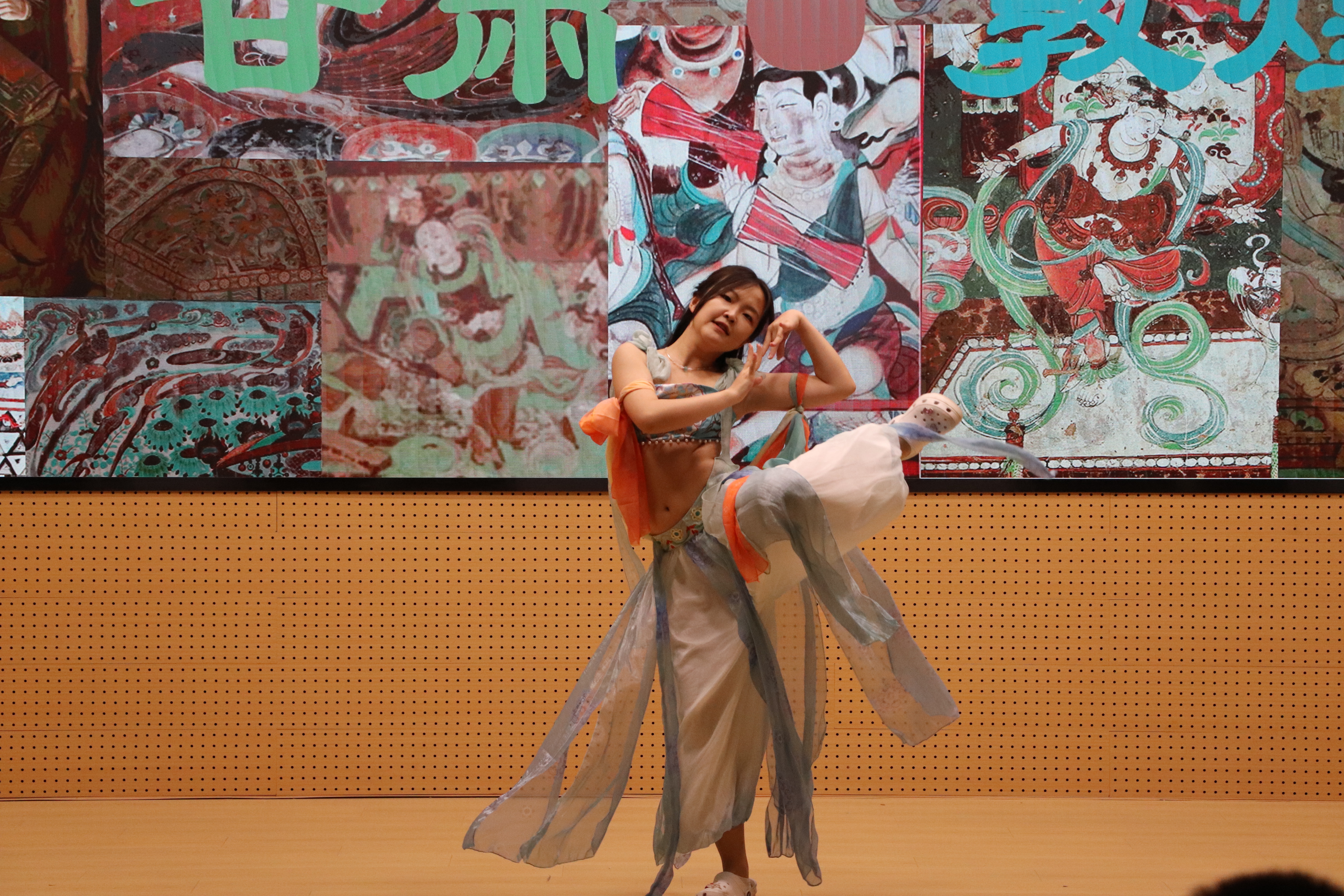 王苗同学带来的敦煌舞《古兰朵》,每个手势和动作都是莫高窟壁画上的样子,惟妙惟肖的舞蹈动作,让大家感受到了敦煌舞蹈的西域风情,感受到了敦煌千年璀璨文化。