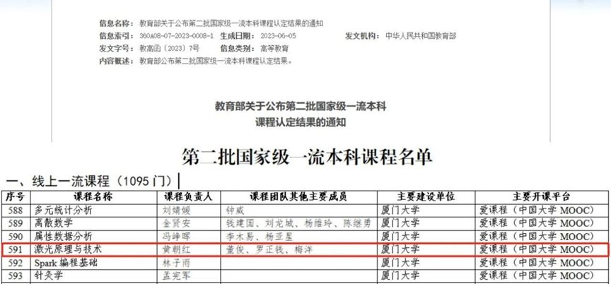 根据《教育部关于公布第二批国家级一流本科课程认定结果的通知(教高函〔2023〕7号)》,我院《激光原理与技术》课程入选国家级一流本科课程。该课程负责人为电子工程系副教授黄朝红,课程团队主要成员有副院长董俊、电子工程系主任罗正钱、微电子与集成电路系助理教授梅洋。