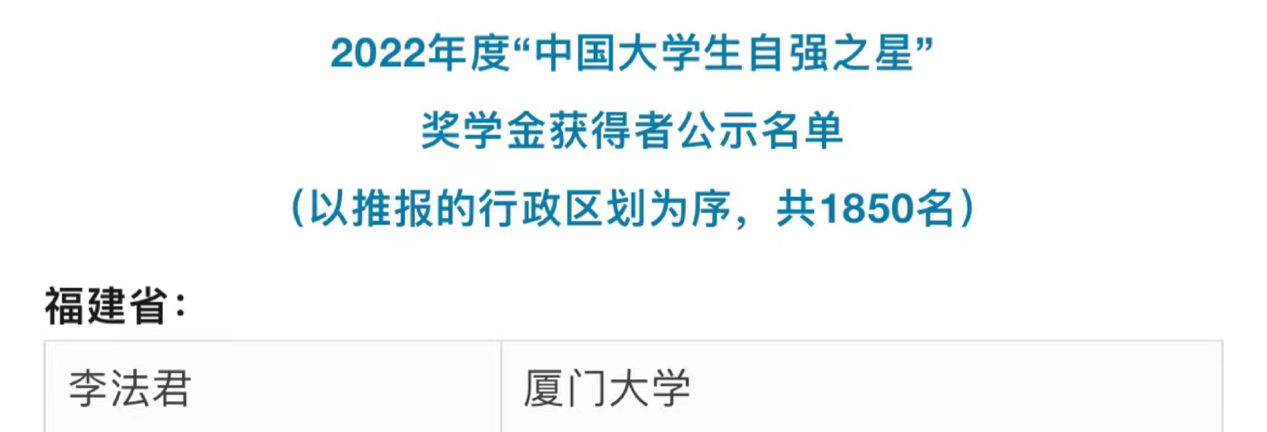 近日,由共青团中央、全国学联等单位共同开展的,2022年度“中国大学生自强之星”奖学金推报活动结果揭晓,经各高校推荐、省级初评、全国评审等环节我校电子科学与技术学院2020级博士生李法君荣获本年度“中国大学生自强之星”奖学金。