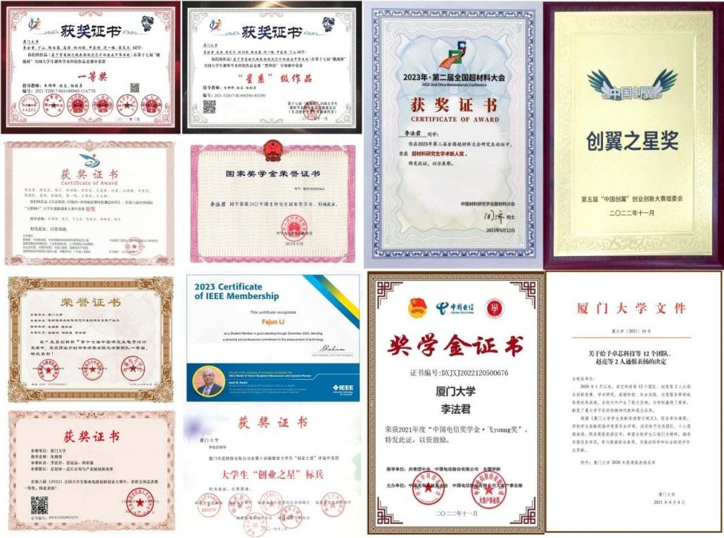 李法君,厦门大学电子科学与技术学院2020级博士生(硕博连读,厦大南强优博计划入选者,CSC英国南安普顿大学联合培养),带领团队获得11项国际/国家级奖项,其中国家一等奖7项;代表福建省参加中国国际高新技术成果交易会和国际光电光博览会,与团队共同研发的相关成果被人民日报社、新华网、德国科学新闻媒体Science Discoveries、福建省新闻联播等媒体报道。获得中国大学生自强之星、厦门大学优秀三好学生、厦门大学优秀团员等荣誉称号;获评国家奖学金、全国超材料大会研究生学术新人奖、中国仪器仪表学会奖学金、中国电信奖学金、葛文勋奖学金、刘晓数理奖学金等;曾在中国研究生创新实践系列大赛——“绽放青春·创新有研”平行论坛作为全国唯二、厦门大学唯一的代表发言。