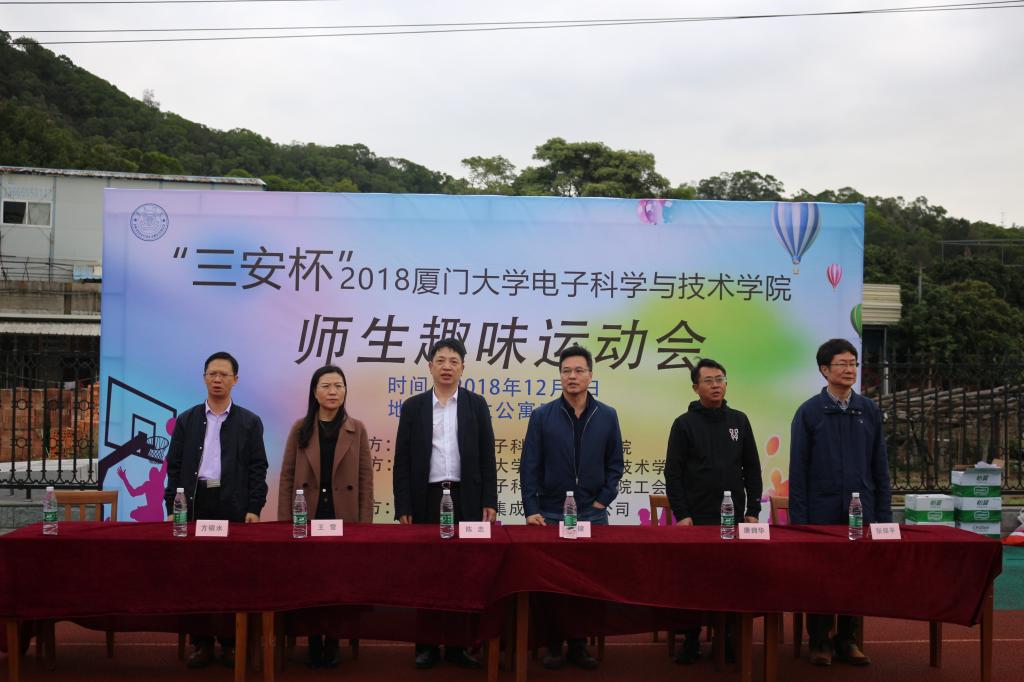 厦门市三安集成电路有限公司杨健副总经理,人力资源部王雪女士,电子科学与技术学院副院长陈忠教授,副院长董俊教授,副院长张宝平教授,党委副书记方银水老师,党委副书记唐拥华老师,三安集成电路有限公司的各位员工,电子科学与技术学院各班主任以及党政老师出席本届趣味运动会开幕式,学院副院长陈忠老师和三安集成电路有限公司杨健副总经理分别为趣味运动会致辞。随后由唐拥华副书记宣布本次运动会正式开始。