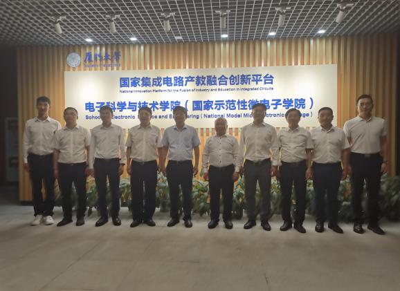 座谈会后,肖立书一行参观了厦门大学国家集成电路产教融合创新平台。陈忠对离子束加工系统、无噪音精密加工与表征系统、微纳加工平台、FIB-SEM双束聚焦扫描电镜系统等尖端仪器设备进行了详细介绍,双方就专业领域的发展进行了探讨。