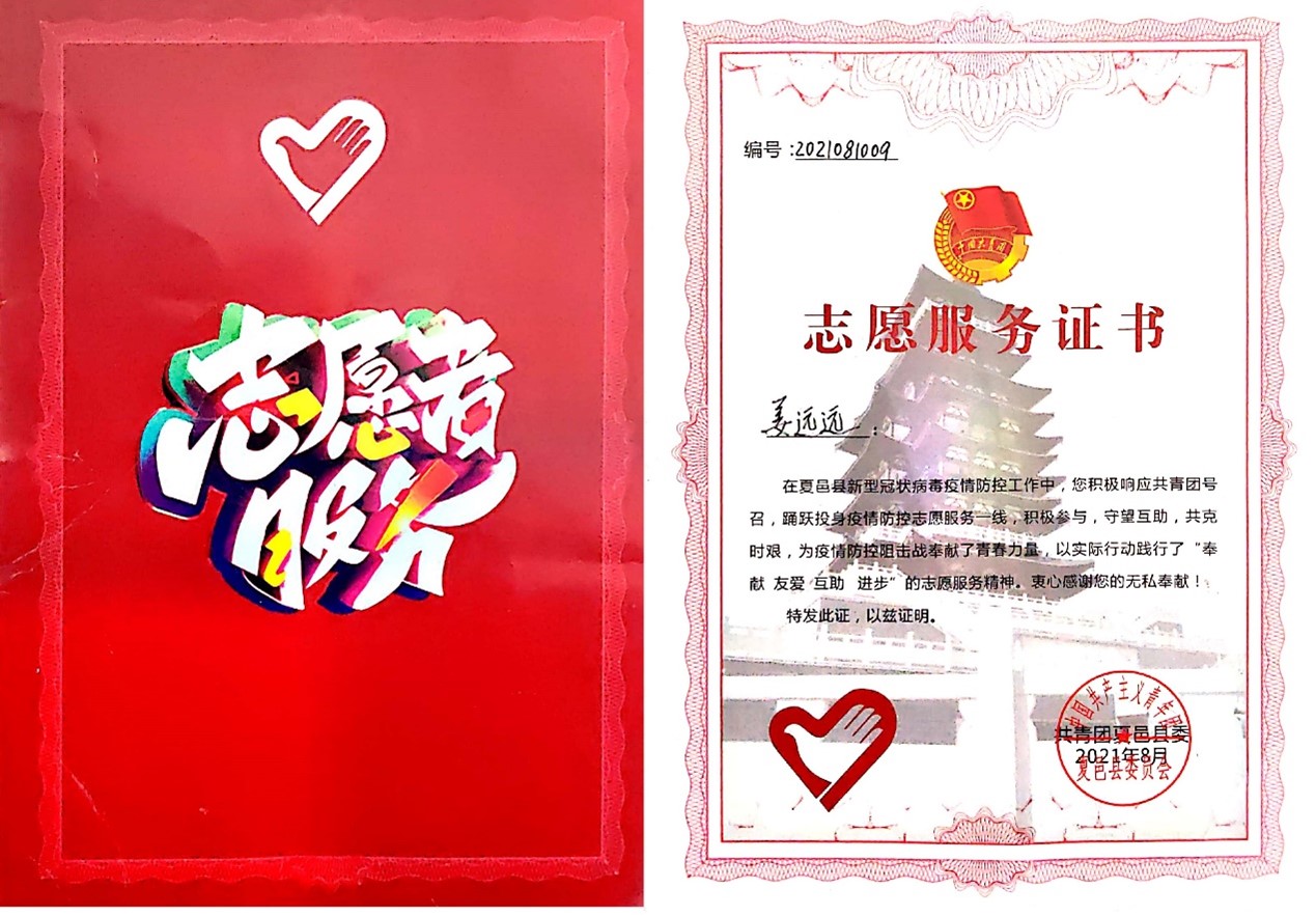 因为淋过雨,所以想给别人撑伞。入学以来,他的志愿服务总时长380多小时。曾组织带领“豫见你”实践队前往河南省做短期支教活动,用自己的成长经历来帮助和他一样贫苦的孩子们树立理想信念。2020年初,新冠肺炎疫情来势汹汹。作为一名中共党员,他也主动参与其中,为疫情防控贡献力量,他也得到了村、乡、县三级表彰,收到了政府部门的感谢信以及荣誉证书,事迹被报道在县级杂志上。在第四届“励志校园·感动福建”优秀学生典型宣传活动中,他作为厦大唯一代表获得“福建励志先锋”提名奖。