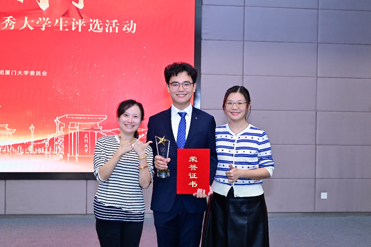 姜远远同学从小学开始就寄宿在学校,学校值班老师经常会透过宿舍窗户拍下他深夜学习的背影。2018年,他在河南100万考生中以3000名的成绩来到了厦大。困难的经济条件没有阻挡他不断前进的步伐,他的成绩始终名列前茅,并在老师的指导下开始了自己的学术研究。功夫不负有心人,本科期间他就以第一作者身份发表2篇SCI论文。进入研究生阶段后,他努力在科创竞赛上为校争光,跟随团队获得2023年挑战杯全国大学生课外学术科技作品竞赛全国特等奖,同时,还获得“创青春“中国青年创新创业大赛全国银奖等国家级省部级奖项共6项。