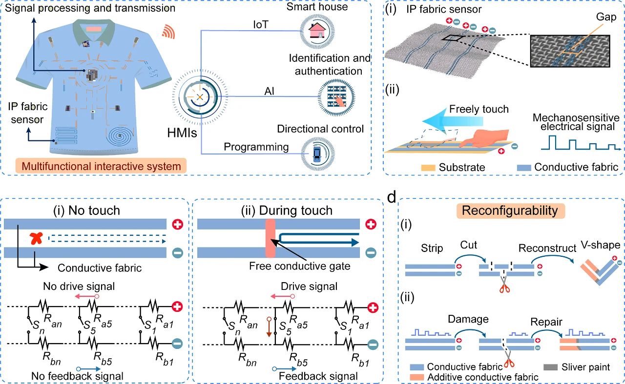 为了解决现有硬质电子器件的局限性并促进人体增强领域的发展,研究团队发展了一种智能的、可编辑的织物型触摸传感器(IP织物传感器),可赋予人类与外界互动的能力。该IP织物传感器的传感结构是利用导电织物并联成平面内的电双边结构,可以实现了将触摸信号转换为电信号,这使IP织物传感器不仅能够检测是否衣物有被触摸而且能准确识别触摸位置。该IP织物传感器采用了单层结构的设计,具有可重构性,这允许IP织物传感器可以被定制成不同的形状。此外,这种单层导电织物的设计避免了IP织物传感器在被佩戴时,即使因变形也不会产生错误的电信号,确保了在没有触摸的情况下,不会有指令发送。最后,研究团队结合人工智能、物联网技术和编程技术,设计IP织物传感器以完成闭环互动娱乐系统、智能家居系统、用户身份验证系统的验证。这些验证显示了该IP织物传感器的多功能性及其在推进人体增强交互式系统中的潜力。