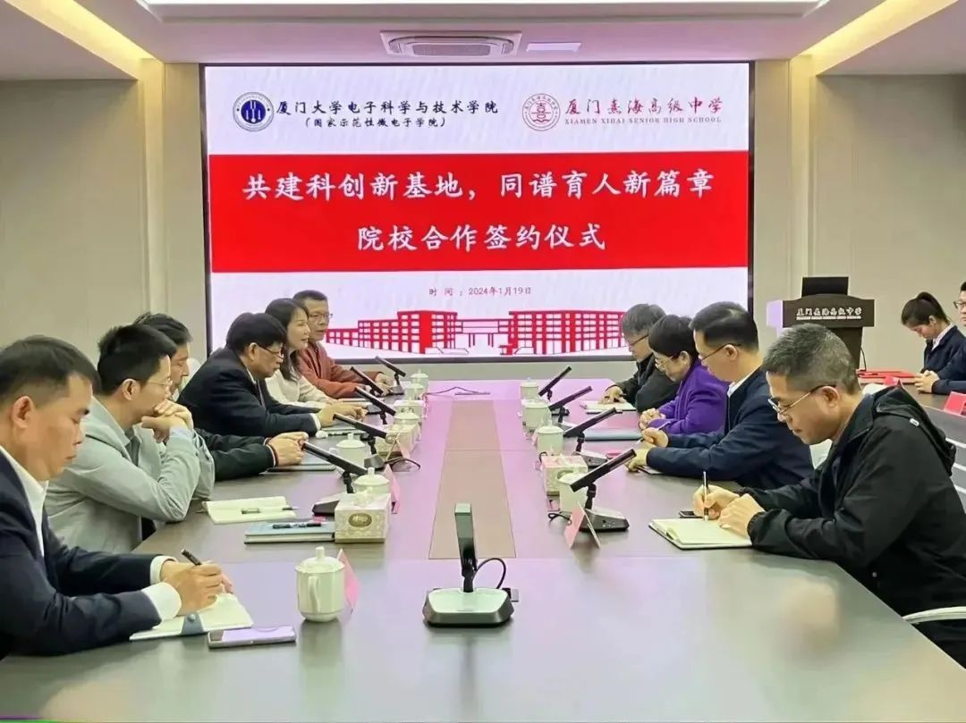 2024年1月19日下午,国家示范性微电子学院――厦门大学电子科学与技术学院与厦门熹海高级中学合作共建签约仪式隆重举行。厦门大学电子科学与技术学院党委书记石慧霞和副院长方银水等一行4人,海沧区教育基金会理事长周威榕,厦门市教育学会会长林佳添,海沧区教育局四级调研员陈江,厦门熹海高级中学校级及行政班子出席。