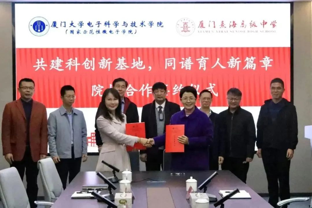厦门大学电子科学与技术学院党委书记石慧霞与厦门熹海高级中学负责人郑希上台签约,互换协议。双方秉持合作促共赢、交流促提升的发展思路,建立良好的院校合作机制,力促双方合作向更宽领域、更高层次发展。