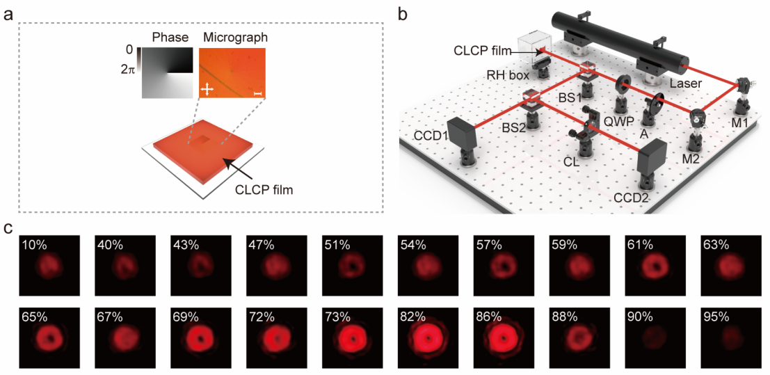 研究团队采用单波长监测系统,对编码单个q-plate的湿度响应型CLCP薄膜进行了详细的反射衍射特性分析(图2)。实验结果展示了CLCP将环境湿度的实时变化转换为可视化信号的能力,凸显其在实时、远距离监测领域的应用潜力。