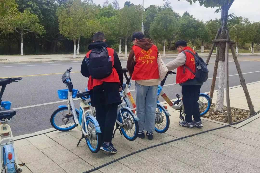 学院组织志愿者进行校园志愿活动。志愿者们认真整理倒地的自行车、电动车。帮助车辆整齐停放,还骑行车道一片整洁,创造安全的骑行环境。