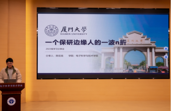 集成电路设计与集成系统2020级本科生陈宏扬分享了他保研之路的学习体验和坎坷曲折,鼓励同学们找准适合自己的学习方法。他提到要学会利用思政课的实践机会,和同学们建立默契,搭建共同学习的平台,交流各种信息,瞄准一项竞赛,在参赛过程中提升自己的专业素养和动手能力。
