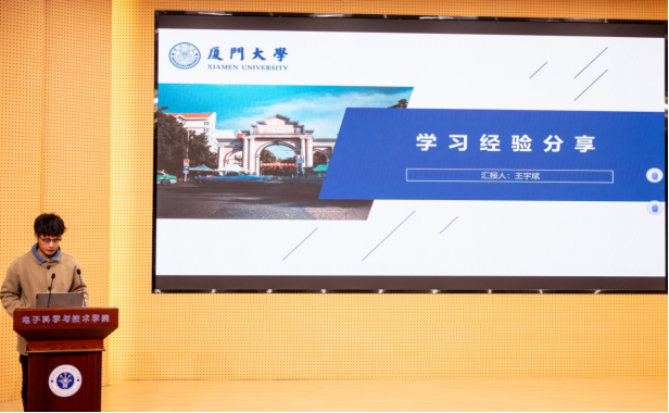 会议伊始,电磁声学研究院2023级研究生王宇斌从学习方法、作息安排等方面分享了他的学习经验。他结合本科期间的学习经历鼓励大家学习上遇到挫折不要灰心,摆正心态,积极探寻适合自己的学习方法。同时,他还分享了本科期间在电磁场与无线技术专业学习的感受,为大家之后的专业选择提供了参考。