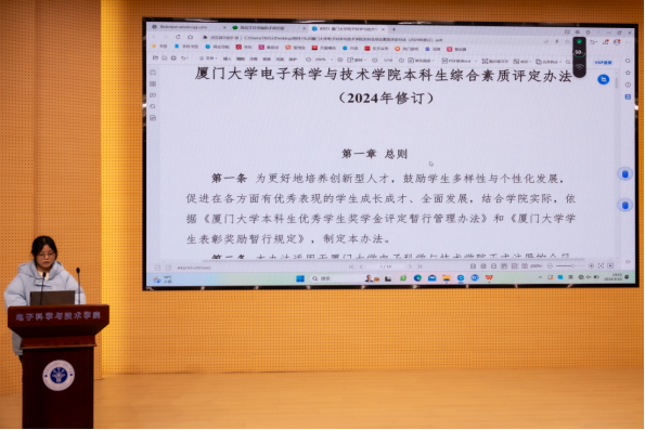 学术部负责人艾思丹对学院2024年修订的《厦门大学电子科学与技术学院本科生综合素质评定办法》进行解读,对其中修改的细节进行了详细的讲解。此次解读培训会让同学们对综测有了更清晰的了解,对未来几年的学涯规划、努力方向有了进一步认知。