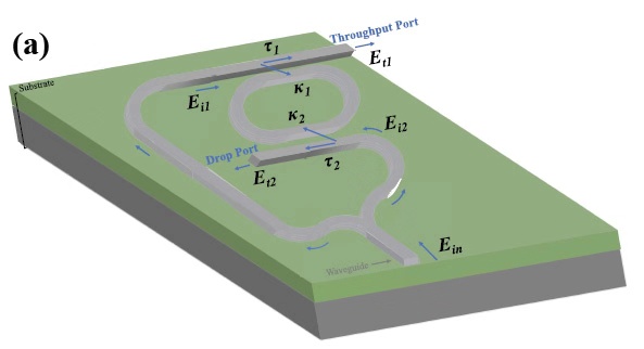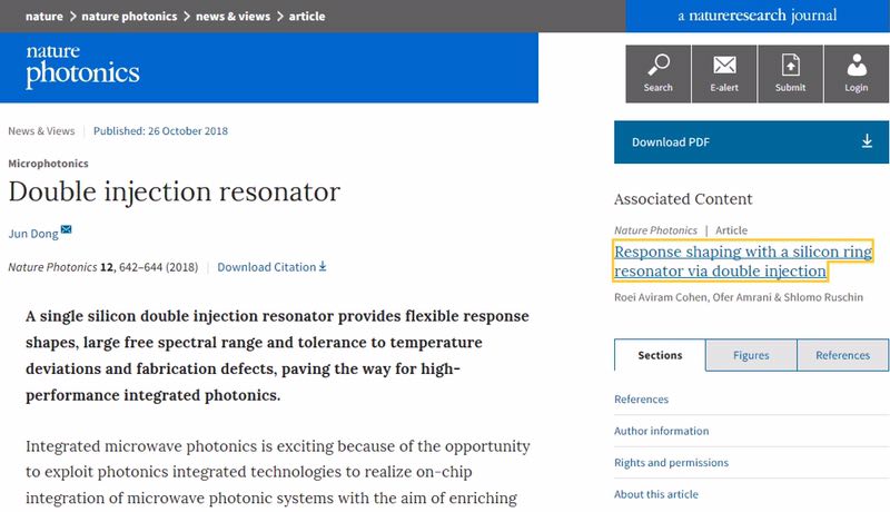 董俊教授重点评论了以色列特拉维夫大学电气工程学院的Cohen等人发表在《自然•光电子学》杂志上最新工作(https://www.nature.com/articles/s41566-018-0275-4)。他们提出了一种新型的基于硅光电子学的双注入谐振腔理念。通过在SOI衬底上设计一种新型的双注入谐振腔,在一个谐振腔中实现两种不同FSR信号输出,其中一个FSR是传统环形腔FSR的两倍。且通过调节耦合系数获得了周期性、三角形和矩形等多种样式丰富的输出信号响应波形。从而为大规模集成电路的设计提供了一种新型、方便、实用、可编程的高度集成硅光电子器件。