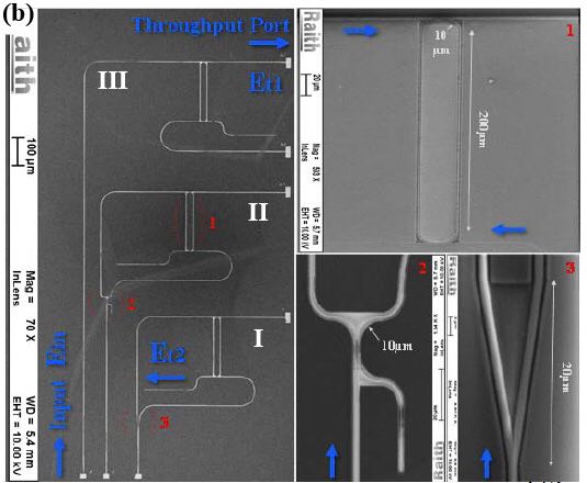 集成微波光电子学利用光电子集成技术实现多功能和高性能的单片集成微波光电子系统,在手机、无线和星际通信、以及电视、分布式天线系统、光学信号处理和医学成像等领域凸显出巨大的应用潜力。基于光电子集成电路的器件拥有可编程能力,可以实现时间微分、延时和频率识别等多信号处理功能,具有结构紧凑、价格便宜的优势。硅光电子因具有和CMOS技术的兼容性及可与电子学无缝集成的优势,成为微波光电子系统集成的一个研究热点。高质量SOI平面波导电路为光电子器件的小型化和大规模集成提供了可能,再加上硅单晶优异的三阶光学非线性效应、易于加工等优势使硅光电子器件易于实现诸如放大、调制、激射和频率转换等功能。因此,基于硅光电子集成器件极大降低了工作面积、元件间耦合损耗和封装价格,非常适合大规模集成电路的制备。频率或电信号响应是硅基集成光电子器件实现多功能和可编程电路的重要参数。虽然采用多光学元件的方式可实现不同响应信号波形的输出,但复杂的设计增加了光学元件之间的相互作用,引入了附加损耗,不利于光电子集成系统的大规模集成化。且大的自用光谱宽度是消除光电子集成电路不同信道间干扰的主要因素。而自由光谱宽度(FSR)与光学谐振腔的腔长成反比,通过缩短腔长获得大的FSR也导致传输损耗的增加,使得工作电压提升。利用光子晶体或复杂环形腔尽管可以增加FSR,也使得器件的设计加工复杂困难,且不适合与电路系统集成。这些系统对损耗非常敏感,使得批量生产受到限制。因此,非常有必要研制新型的方便实用、可编程的硅光电子集成电路。
