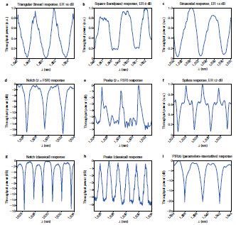 该工作研究人员所设计的双注入环形谐振腔是通过在一个谐振腔中预先设置的位置处注入两束同一波长的相干光信号实现的。双注入谐振腔所采用的SOI衬底是在2微米厚的氧化硅上的一层厚度为220-nm的微量掺杂硼的硅,双注入谐振腔是通过电子束蚀刻技术所形成尺寸为450 nm ´ 220 nm的波导,最后切割成1 ´ 1 cm2的芯片。且在谐振腔的端面设置了渐变的波导方便和外部的光纤相连接。利用方向性耦合器来分光形成两束不同幅值和相位的光束,而利用一个传统的Y型耦合器对入射光进行平均分束。通过合理选择耦合系数和入射分光系数,在主动型的双注入谐振腔中实现形式丰富的传输信号响应,如三角形、矩形、正弦、峡谷(2 ´ FSR)、峰值(2 ´ FSR)和类正切性尖峰等。这些在实验中得到的信号响应波形在各种射频模拟和数字传输器和接受器中具有非常广阔的应用潜力。且双注入谐振腔所特有的两个FSR运行特性可以用于实现更宽的运行带宽和低能耗运行。特别有意义的是在研制出的参数不敏感响应器件(PIR20)由于具有对制备缺陷、温度以及光电效应的不敏感性,从而可以获得在消光比为20 dB的情况下比传统环形腔更高的容错度,非常适合大规模集成生产和器件的稳定运行。
