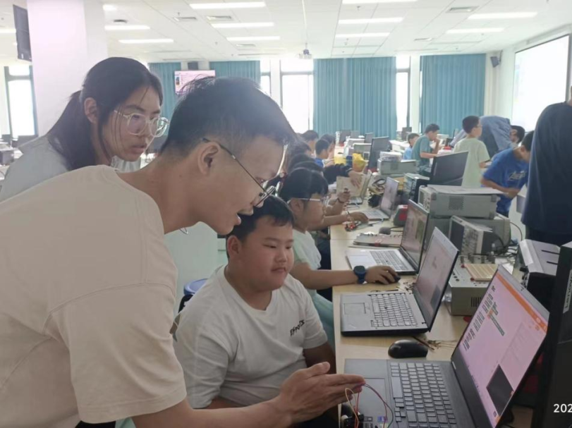 南强电子设计协会的成员们分组对演武小学的同学们进行一对一的科创帮扶指导,耐心、热情地指导小朋友们完成基础电子知识、微控制器引脚相关知识、图形化编程的概念逻辑等知识的学习。