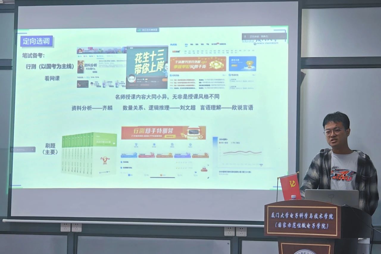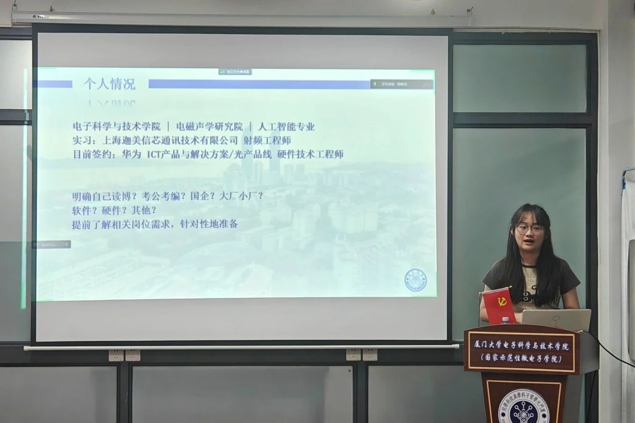 为帮助学生进一步明确发展方向、及时做好发展规划,6月3日晚,电子科学与技术学院2024年硕士研究生升学就业分享主题党日活动在博学二一站式学习共享空间顺利举办。活动邀请了学院党政辅导员陈斯杰以及五名2021级硕士毕业生进行经验分享。活动由电磁声学研究院硕士生2023级党支部书记周成凤主持。