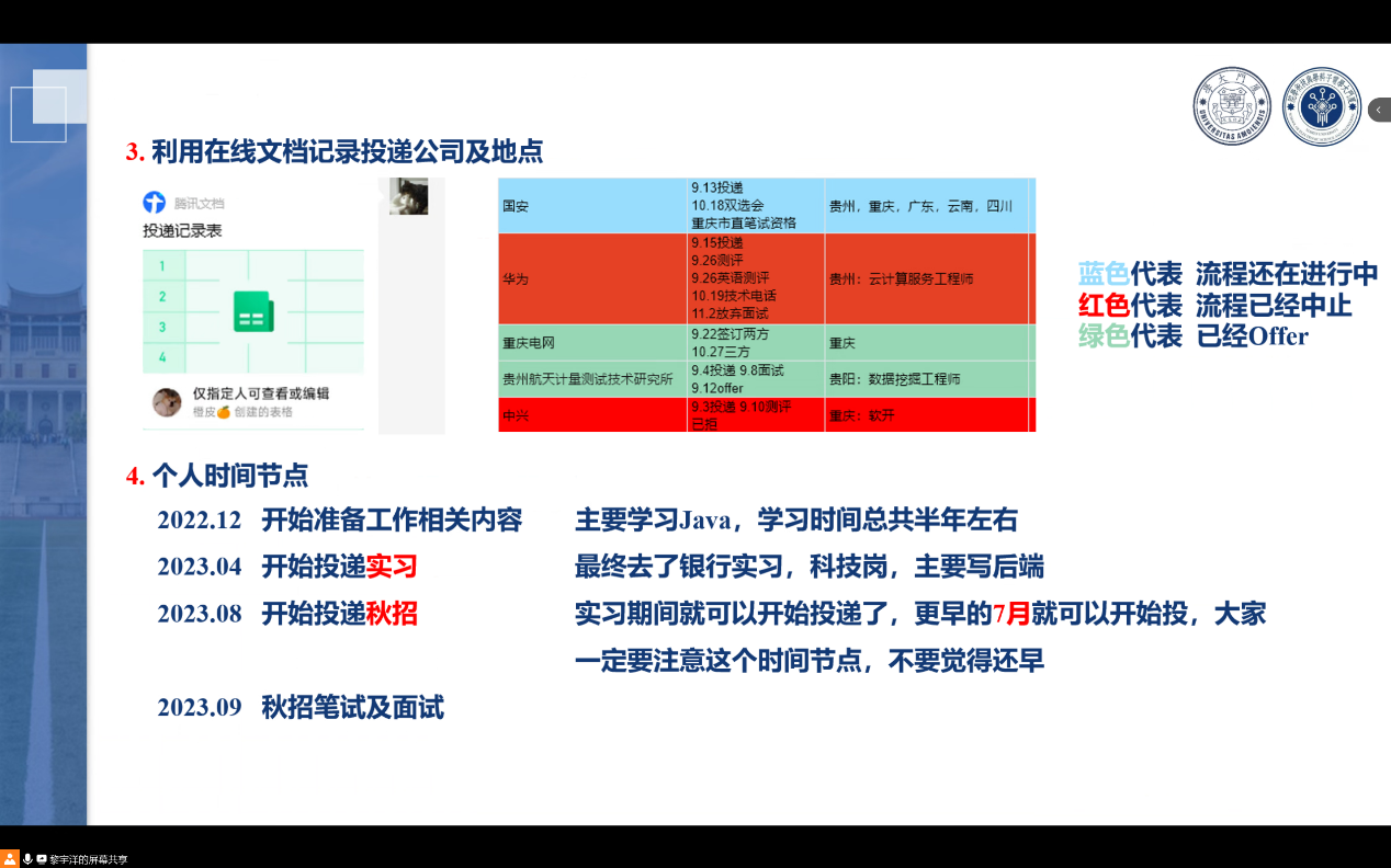电子信息专业毕业生吴雨伦介绍了自身学生工作经历,举例说明了不同银行的招聘条件、部分地区的人才引进政策和定向选调生政策,分享了选调生备考的经验和信息获取渠道。他提到,研究生一年级学生可以尽早了解相关信息,在学期间紧抓机会完善自身履历,求职期间选择合适的岗位投报,以免不符合报名条件和错过面试时间。