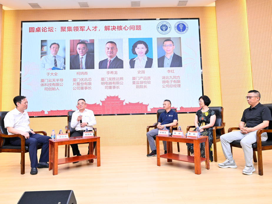 沙龙设置了圆桌论坛,论坛由厦门云天半导体科技有限公司创始人于大全主持,嘉宾们围绕“聚集领军人才,解决核心问题”主题展开了热烈讨论,为学院的人才发展战略提供了宝贵的建议。厦门优迅芯片股份有限公司董事长柯炳粦认为,高校教师与企业合作能有效促进创新,企业需要颠覆性的突破,两者应加强合作应对复杂的外部环境。李希龙建议,教师应发挥各自专长,理论与实践相辅相成,合力创造成果。于大全鼓励年轻教师承担重任,选准方向,为学术界做出贡献。厦门市产品质量监督检验院院长史园认为,理论研究与实践应用相结合,应当加强校企合作,推动科技发展和人才培养。湖北九同方微电子有限公司总经理李红认为,绝大多数产业挑战的破解之道在于增强实践互动,强调了场景验证在产业中的作用。