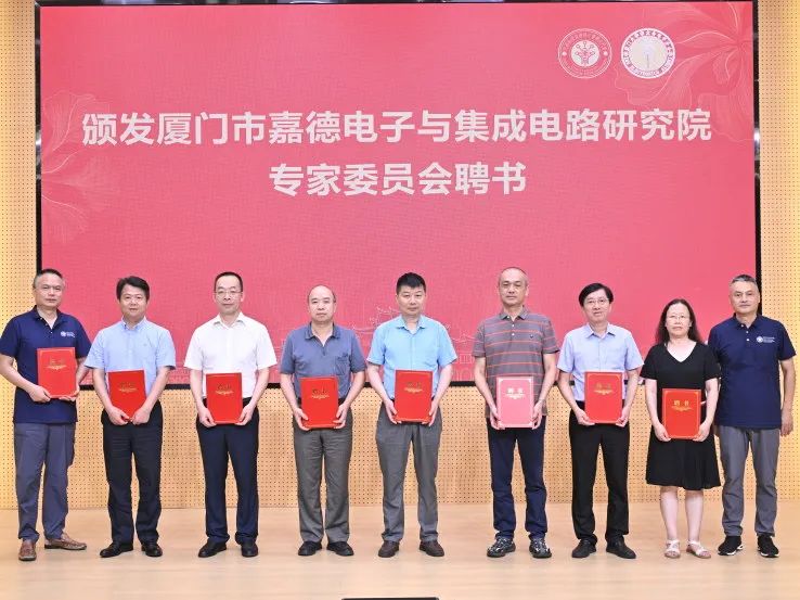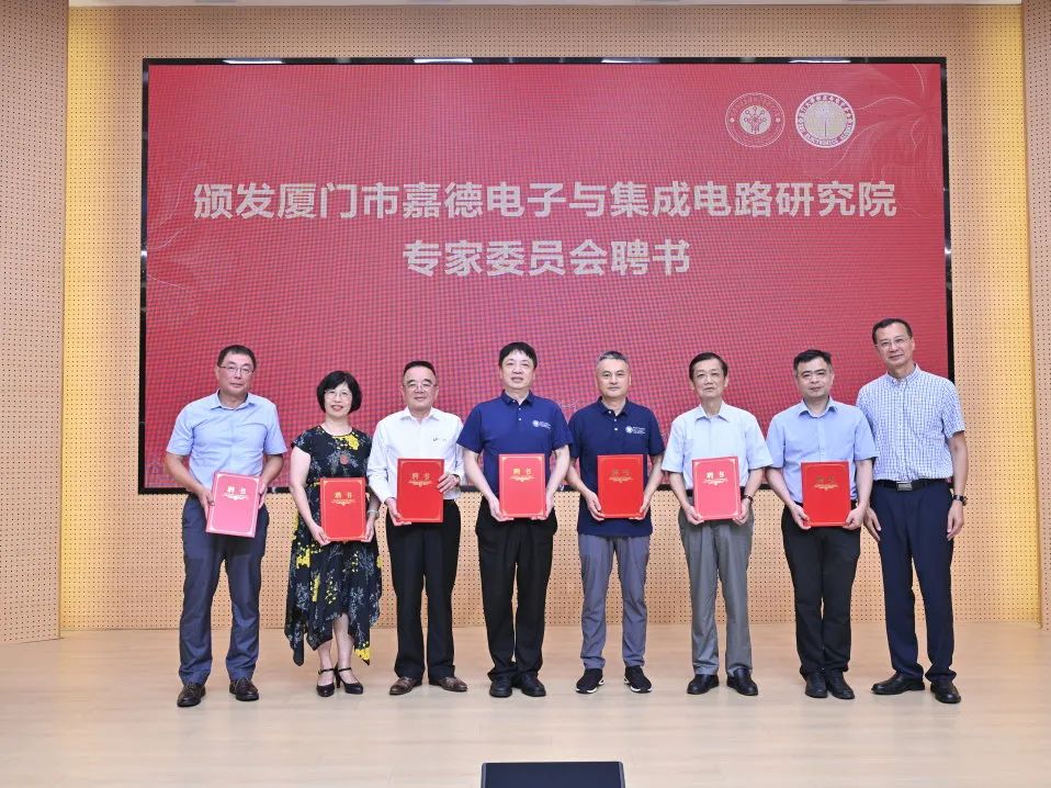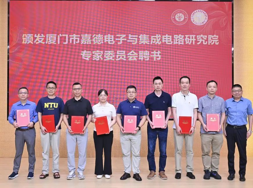厦门市嘉德电子与集成电路研究院专家委员会正式成立。专委会成员涵盖校内外各领域专家,将为研究院的发展提供战略指导和专业意见,推动行业的技术创新与人才培养。赖虹凯、邓建华、李希龙分别为他们颁发专家委员会聘书,并合影留念。