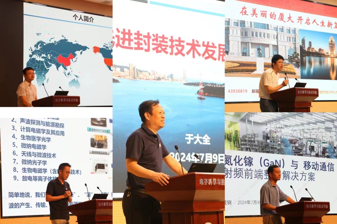 随后,学院各招生单位老师给同学们带来了五场别开生面的讲座。南强青年拔尖人才、电子工程系易骏副教授作题为“纳米光子学实验室”的讲座,介绍了电子工程系纳米光子学实验室的研究方向和培养模式。福建省高层次人才、电子科学系林雁勤教授结合亲身经历,以“研究生学习与发展”为题,向营员讲述了自己的感悟与建议。国家万人计划领军人才、闽江学者特聘教授、微电子与集成电路系主任于大全教授作题为“先进封装技术发展与创新”讲座,详细介绍了先进封装技术发展综述和厦大先进封装技术进展。闽江学者特聘教授、电磁声学研究院刘泉教授作题为“面向实际应用的光学光谱技术进展”的讲座,带领大家了解光学光谱技术进展。国家集成电路产教融合创新平台企业导师代表、三安集成电路有限公司氮化镓射频功率产品线产品总监成钢以“氮化镓与移动通信-射频前端整合解决方案”为题,讲述氮化镓与移动通信产业发展情况和射频前端整合解决方案。现场,营员们聚精会神地听专家老师带来的精彩讲座,收获满满。