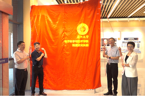 8月30日下午,经过近一年筹建,电子科学与技术学院院史文化长廊在翔安校区文宣楼一楼举行了简朴隆重的开展仪式。厦门大学党委原副书记、校关工委常务副主任、校友总会副理事长赖虹凯;1985级校友、厦门厦华科技有限公司总经理、厦门大学校友会电子分会副理事长商永金,1994级校友、星宸科技股份有限公司董事长兼总经理 、厦门大学校友会电子分会理事顾问林永育,国投智能(厦门)信息股份有限公司纪委书记、高级副总经理、厦门市美亚柏科信息安全研究所有限公司董事长周成祖,学院党委书记石慧霞,院长陈忠,副院长董俊、李澄、方银水,党委副书记韩海雄、党委委员蔡励元,电子工程系主任罗正钱、电子科学系主任蔡淑惠、电磁声学研究院院长朱锦锋,学院党政人员、辅导员及学生代表参加本次活动。仪式由学院党委副书记林蕊主持。