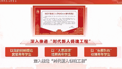 新时代以来,我们坚持以习近平总书记致厦门大学建校100周年贺信精神领航,深入推进“时代新人铸魂工程”,以党的创新理论武装青年学生,以“大思政课”培育青年学生,以“头雁队伍”引领青年学生,着力培养更多让党放心、爱国奉献、担当民族复兴重任的时代新人。