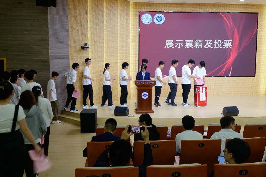 大会进入正式会议阶段。大会筹备组委员朱辰璠宣读大会筹备工作报告,资格审查工作小组组长余婧阳宣读代表资格审查报告,筹备工作小组委员张祁祁宣读大会选举办法,在场师生代表依次听取并审议通过。大会筹备工作小组委员朱辰璠宣读监票人、计票人建议名单,与会代表逐项审议并表决通过。