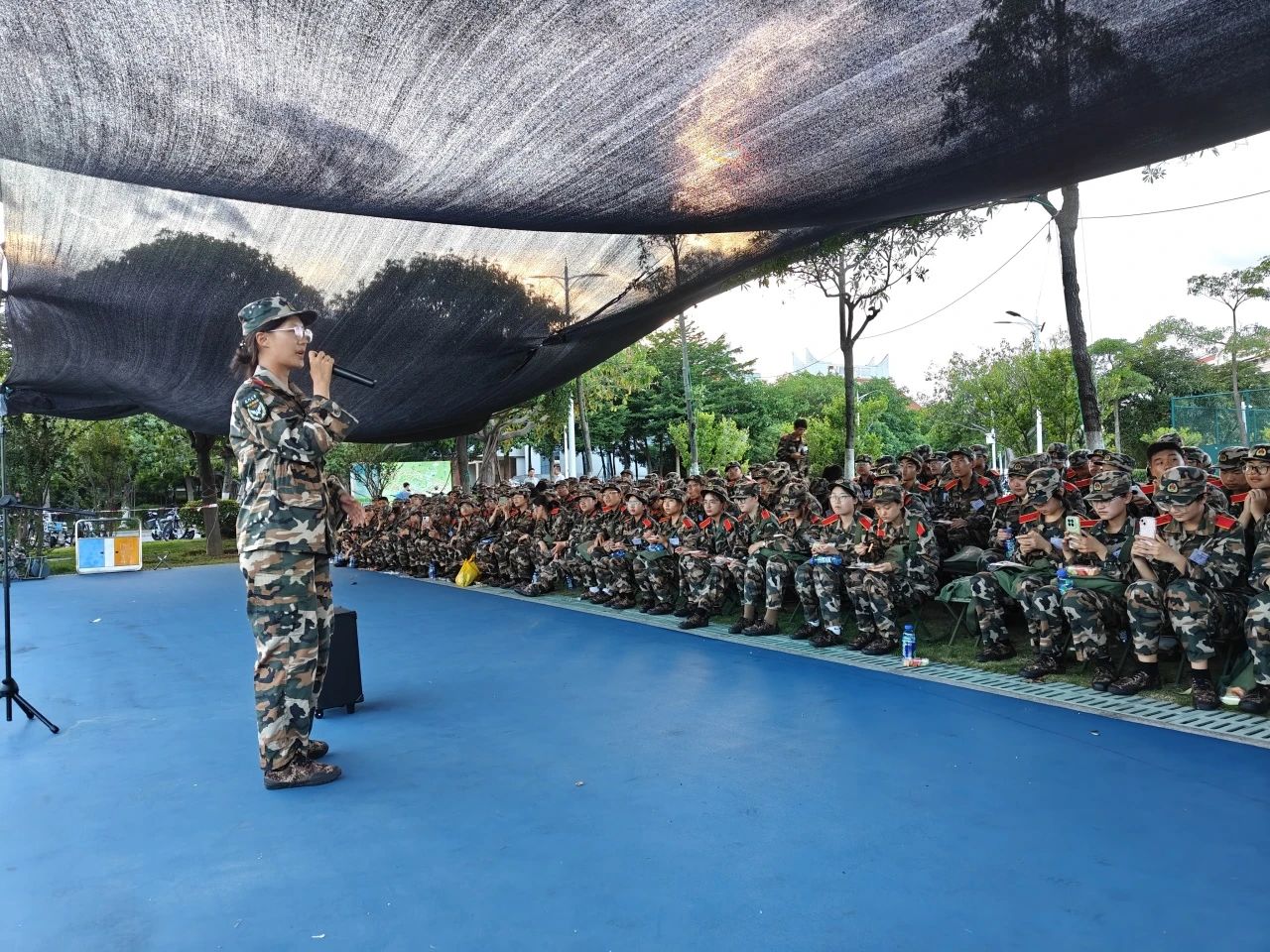 石慧霞书记向承训教官的辛苦付出表示衷心的感谢,对同学们在军训期间展现出来的坚韧不拔的精神给予了高度赞扬。她希望参训同学将“自强不息,止于至善”的校训精神融入训练中,以奋发进取的姿态上好大学第一堂课,为今后的学习生活打下良好的基础,以实际行动迎接新中国成立75周年,献礼陈嘉庚150周年诞辰,在厦大成为与“中国芯”一同成长的“芯青年”。