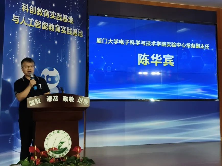 陈华宾围绕年段普及课、社团课、集训课、实践活动等方面对此次合作进行说明。他介绍了校本教材开发、教改项目的合作推进、各级各类赛事的培训指导等内容,强调让科创教育更加系统化、实用化,共同打造具有本土气息的科创教育实践基地。