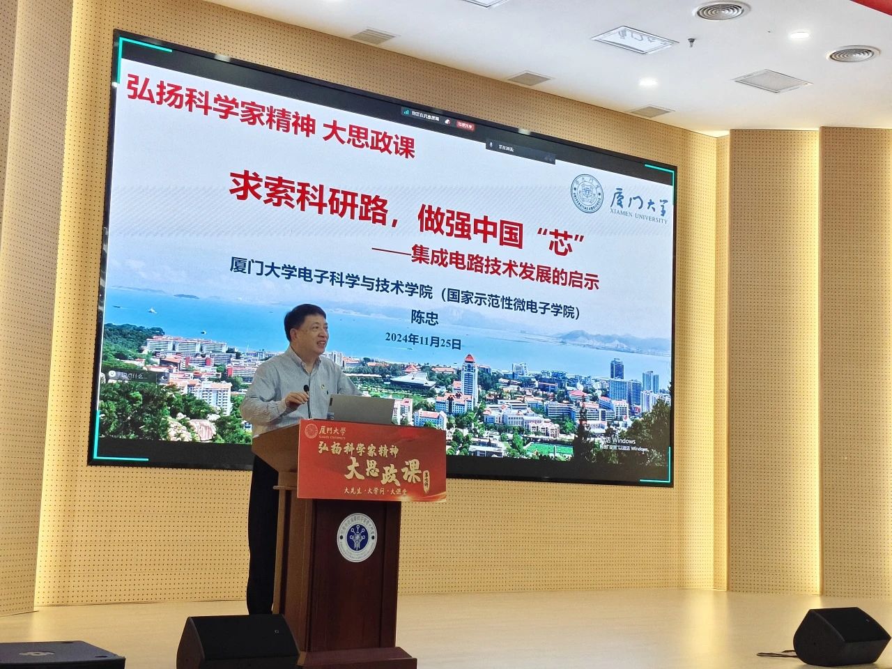 为深入贯彻实施“时代新人铸魂工程”,培养具有引领性、人文性、时代性、开放性的拔尖创新人才,11月25日在南存钿楼C栋4楼报告厅,电子科学与技术学院院长陈忠教授以“求索科研路,做强中国“芯”——集成电路技术发展的启示”为主题,结合自身丰富的工作经历、研究领域及学术成就,为师生们讲述生动鲜活的科学家故事,深入浅出地阐释科学家精神的丰富内涵与时代价值,助力芯青年成为国家需要的优秀人才。