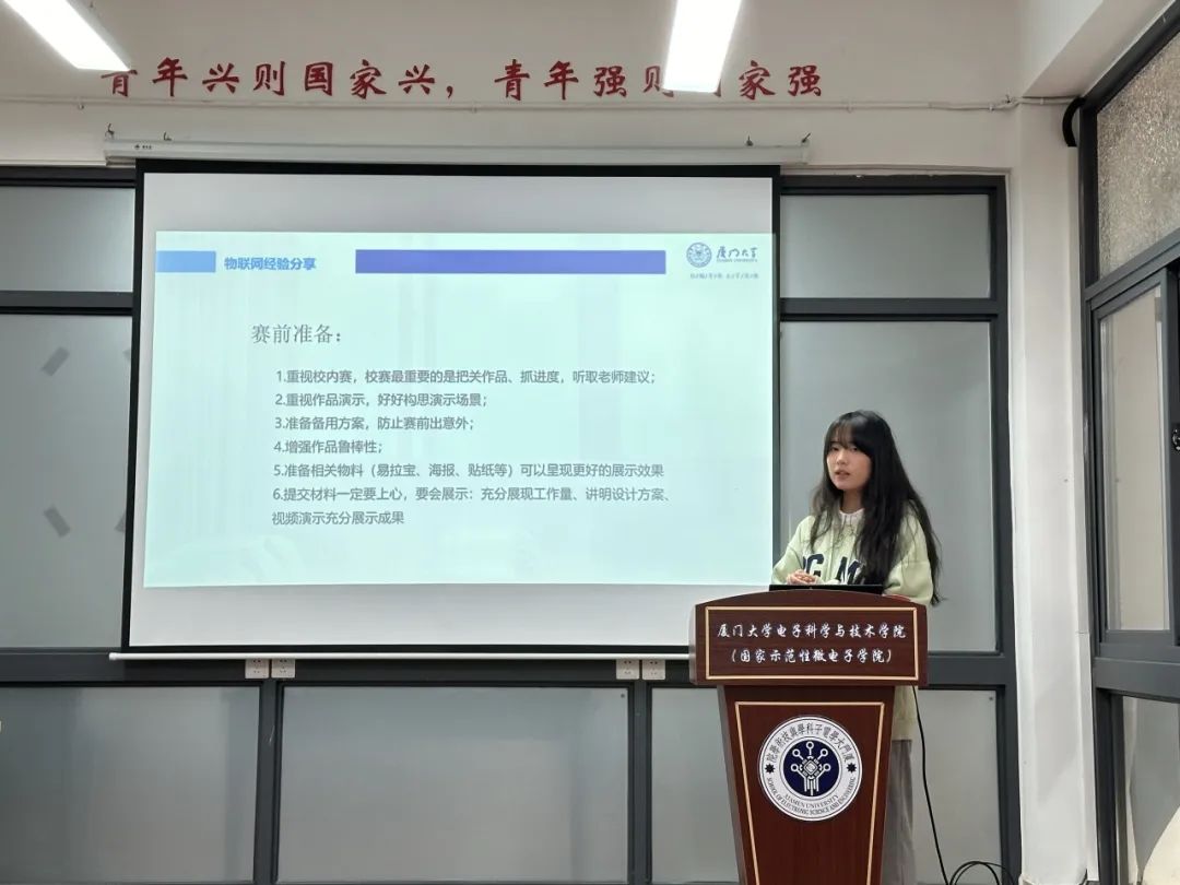2022级集成电路设计与集成系统专业李思思分享了物联网设计竞赛的参赛经验。她认为选题要创新且实用,任务分配要合理,应重视校内赛,积极听取老师建议,严格把控作品质量,构思演示场景,并准备备用方案。她强调,初赛提交的材料要精心准备,充分展示工作量和设计方案,视频演示要突出成果。在答辩环节,提前踩点和测试,注意时间控制,准备可能被问到的问题,保持冷静应对。