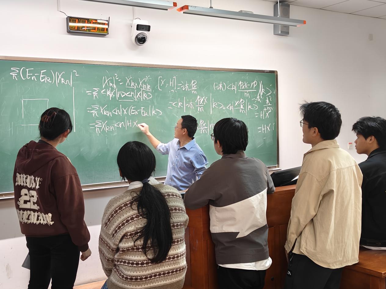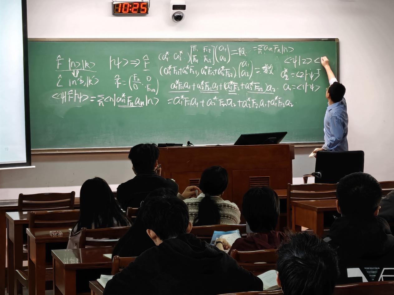 课堂上,张先徽老师将传统板书教学与多媒体教学有机结合起来,深入浅出地解析了量子力学中不同表象的概念及转化机制。他从最基础的模型出发,循序渐进地推导,结合实际应用案例的剖析,逐步归纳总结出普遍适用的规律,并将知识点对应的思政元素自然地融入课堂讲授过程中。