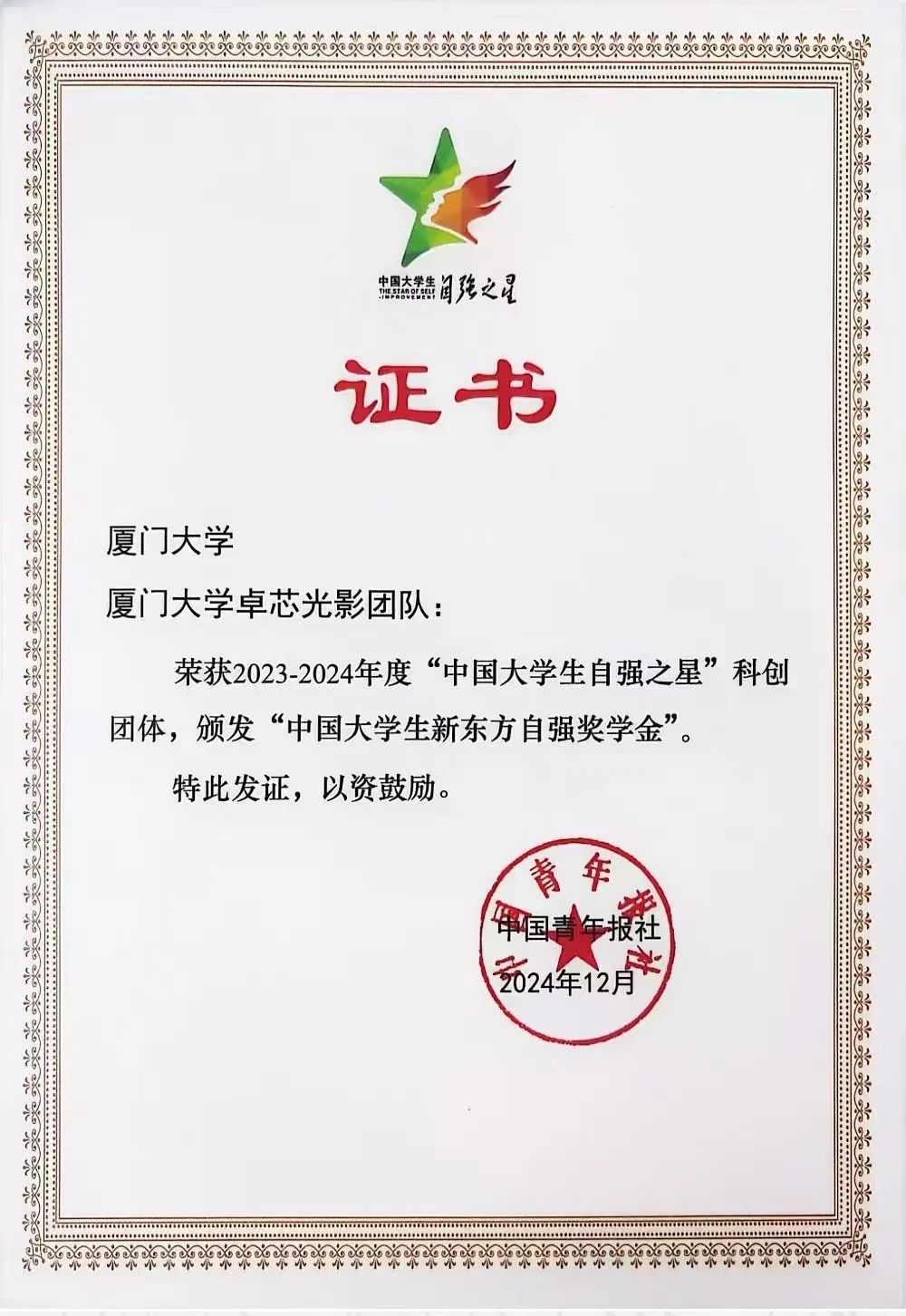 近日,在2023 - 2024年度“中国大学生自强之星”奖学金推报活动中,我院卓芯光影科创团体荣获“中国大学生自强之星”科创团体称号,全国仅有100支科创团体获此殊荣。这一奖项由共青团中央、全国学联指导,共青团中央基层建设部、中国青年报社、新东方教育科技集团、中国青年创业就业基金会联合举办。以“自信自强挺膺担当”为主题,旨在树立热爱祖国、品行优良、不畏艰难、自强不息的大学生榜样。