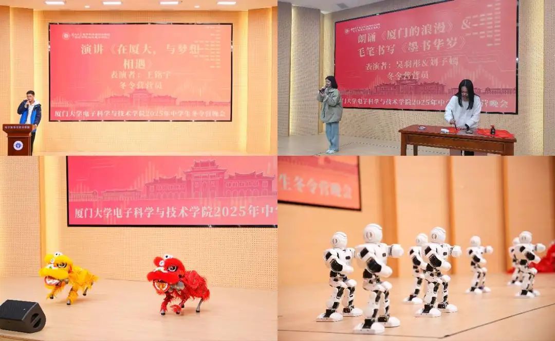 晚会上,营员们展示了冬令营学习成果,观看了舞狮机器狗和机器人表演,厦门大学艺术学院王奕棋与陈曦乔、王铭宇、罗沐涵、吴羽彤、刘子嫣、许宸杨、何欣玲、张沐衍等营员也为大家带来了精彩的才艺表演。